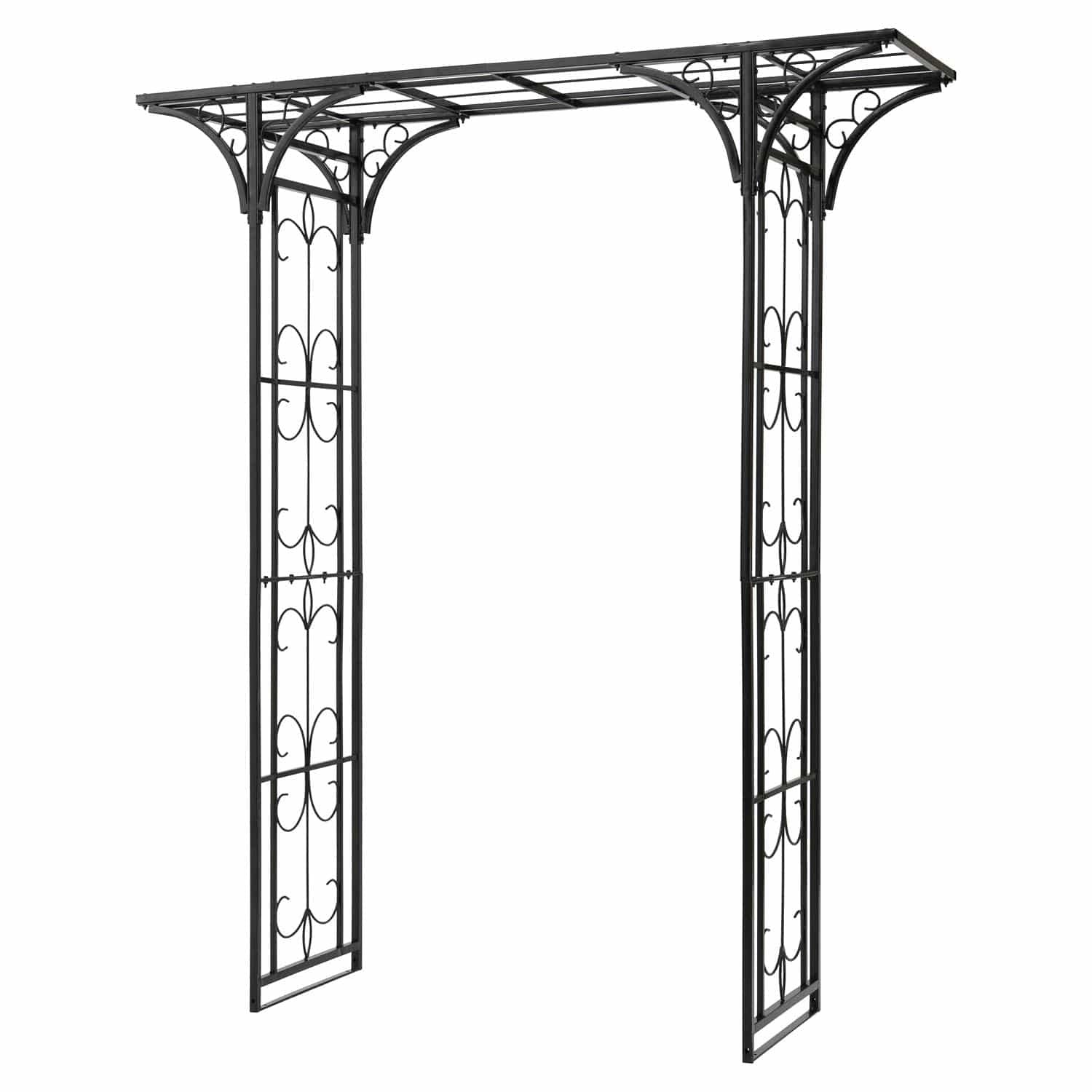 Made from durable black powder-coated steel, this weather-resistant garden arch is strong enough to support the most vigorous of climbing plants. With a width of 180 cm, the garden arch measures 237 cm high and includes ground spikes for extra stability. This garden arch can easily be installed and mounted.