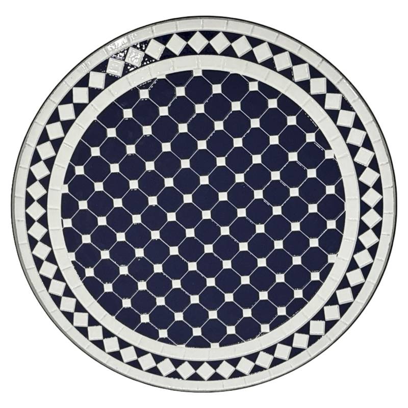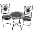 Smart looking blue and white metal and mosaic tile 3 piece setting. Suitable for outdoors, but will last better if kept dry.