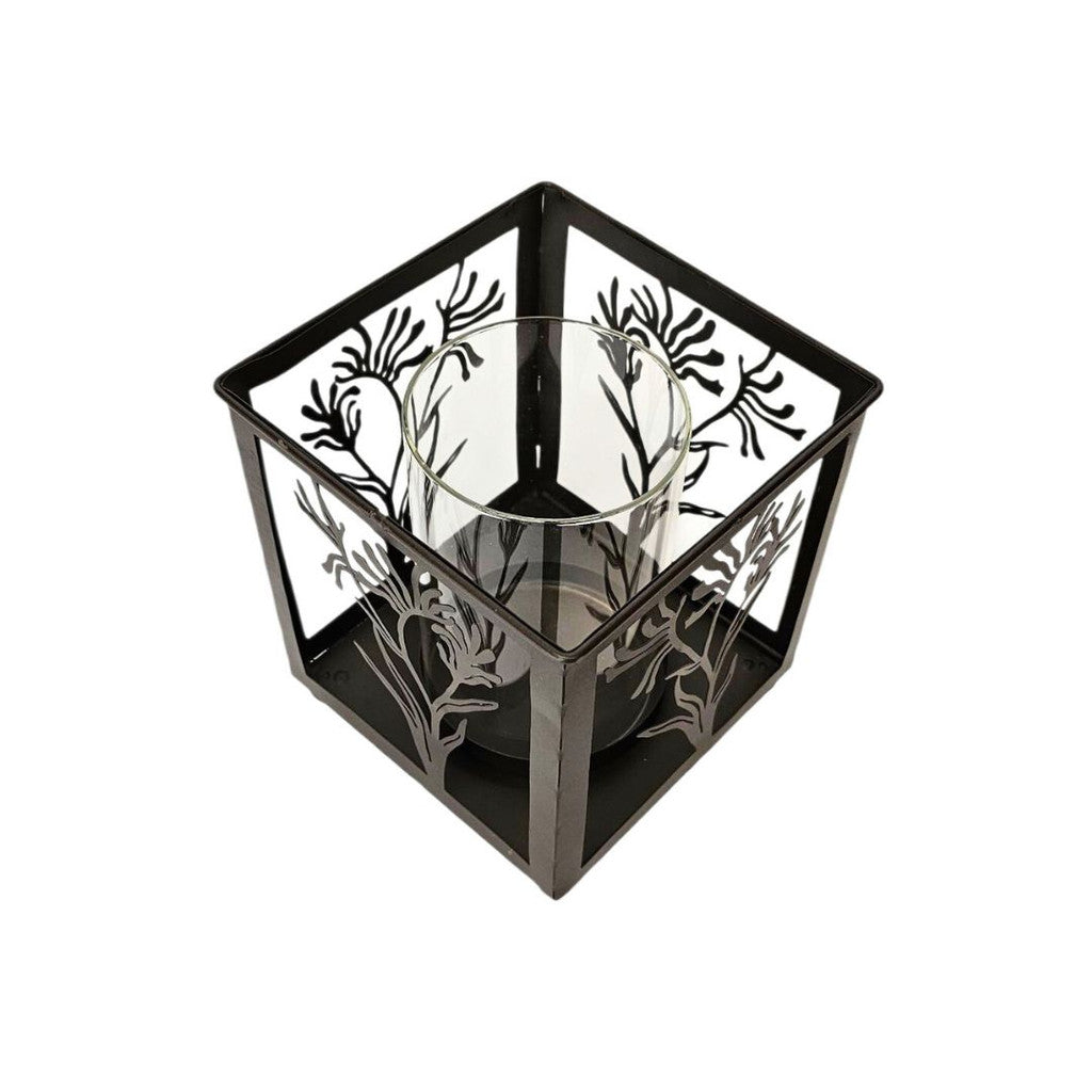 Laser cut metal lantern with kangaroo paw design.