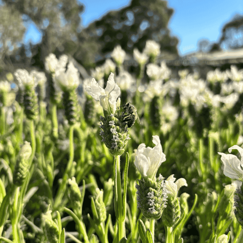 Lavender 'Pippa White' Avonview is a unique and elegant form of Lavandula stoechas, distinguished by its soft white flower heads topped with creamy-white wing-like bracts. Blooming from spring through summer, it adds a fresh, luminous touch to gardens and containers. With its aromatic grey-green foliage and compact habit, it thrives in full sun and well-drained soil. Drought-tolerant once established and attractive to pollinators, it’s perfect for brightening borders, patios, and Mediterranean-style plantings.